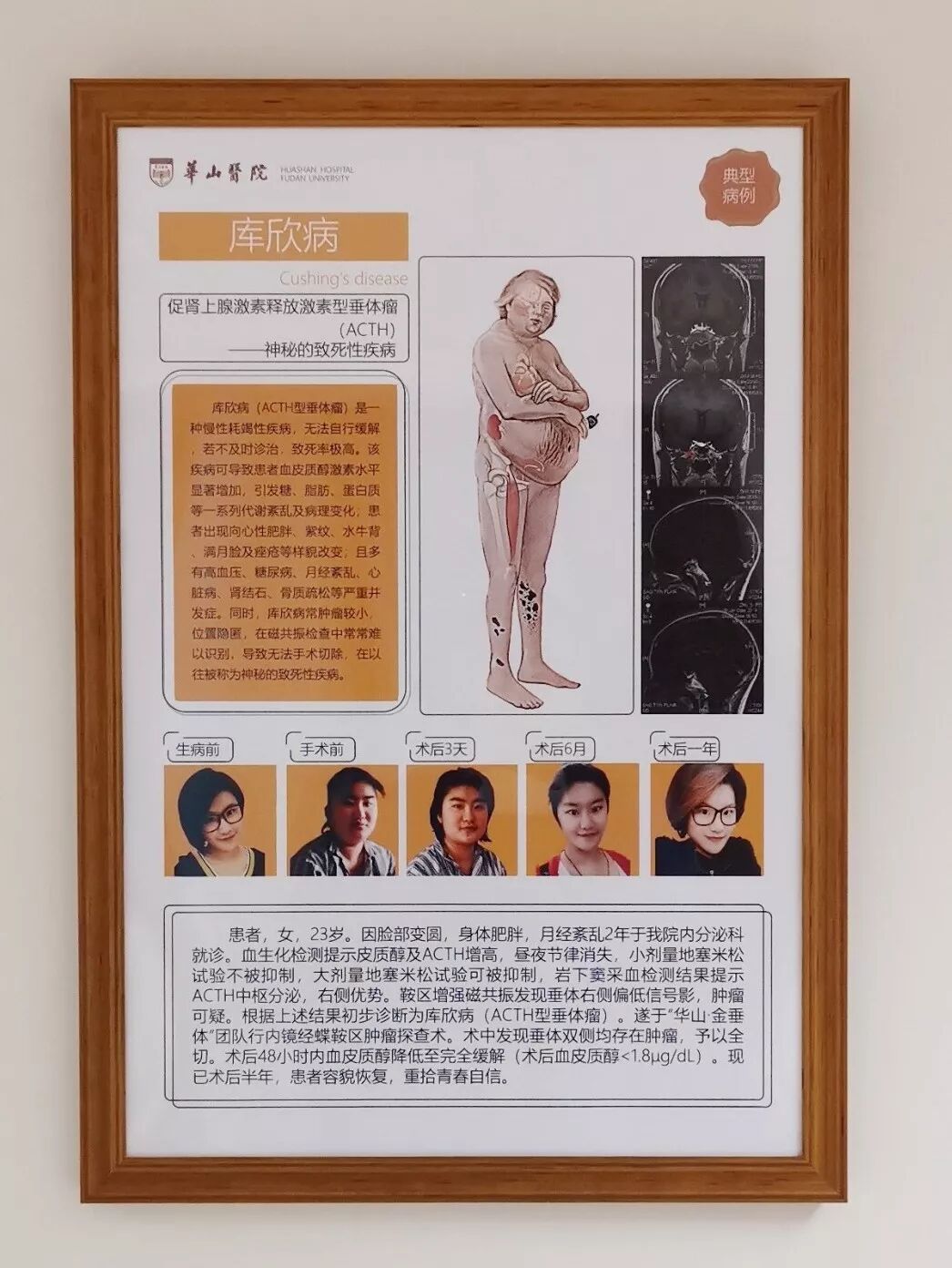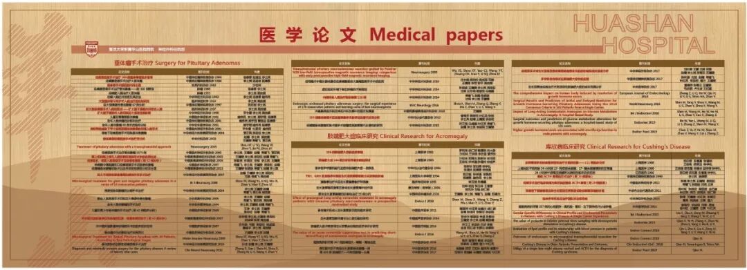 在病区联合办公室的走廊上,悬挂着从上世纪60年代起至今,华山医院发表的所有与鞍区肿瘤(垂体瘤、颅咽管瘤、脊索瘤、生殖细胞瘤、胶质瘤等)相关的论文展板。这不仅是团队学术成果的汇总,更是中国垂体瘤研究的发展史。年轻医生出入办公室,从前辈奋斗的成果中获得持续创新的灵感与动力,也对于脚下“坚实的肩膀”心存敬畏与感恩。