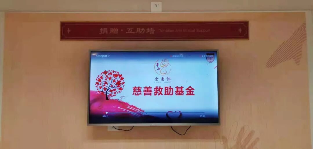 在病房的尽头,更是有一面充满爱的“捐赠墙”。捐赠者主要是社会企业、慈善人士和医护人员。同时因地制宜,为了让那些治愈获救的患者及家属有一个地方表达感谢和感恩,“华山·金垂体”团队成立了“垂体瘤互助基金”,每当患者提出想要制作锦旗、赠送礼物甚至红包,医生会鼓励他们用这些表达感谢的钱去帮助更多深陷垂体疾病困境的患者。一面墙的大屏幕会滚动播出,把爱播出来、传出去。这不仅仅是发扬人道主义精神,弘扬扶贫济困的传统美德,唤醒人与人心底更多的善意,更是创造了医患真情及患友真情。