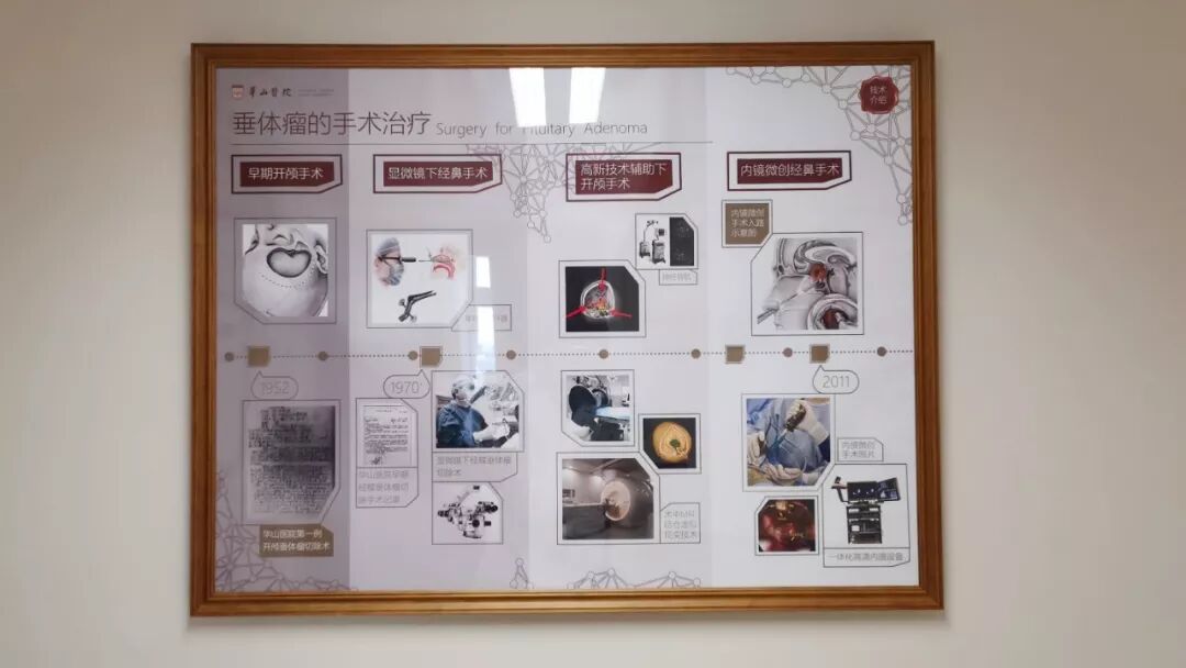 病房的墙面上,专家团队特意设计了手术治疗方法的展示。如“垂体瘤手术治疗”板块,脉络清晰地介绍了垂体瘤手术的四次技术变革:从早期开颅、显微镜下经鼻腔手术,到术中MRI结合VR技术支持下的开颅手术,再到一体化高清内镜设备辅助下的内镜微创经鼻手术。每一次技术进步,华山垂体疾病治疗团队都是最积极的参与者甚至是引领者。